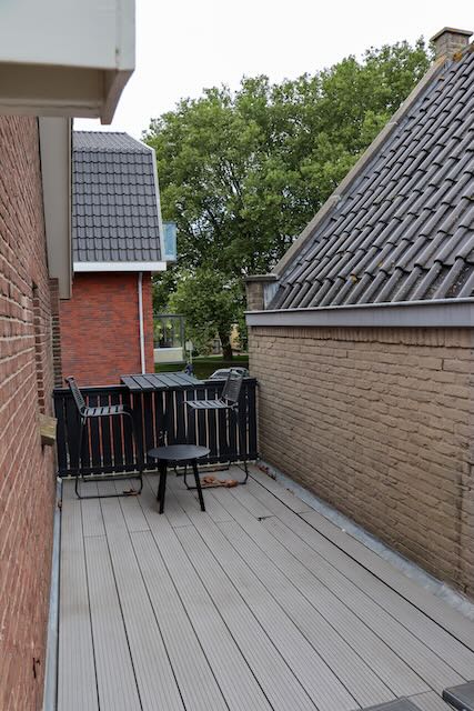Het balkon is 30m2 groot en zit aan weerszijden van het huis. Deze is te bereiken met een kort paadje waar je via een deur op de eerste verdieping op komt. Het balkon heeft een barretje met hoge stoelen aan de linkerkant van het huis, in combinatie met ligstoelen. De rechterkant bevat twee banken. Aan weerszijden vind je meerdere stopcontacten en een lichtsnoer.