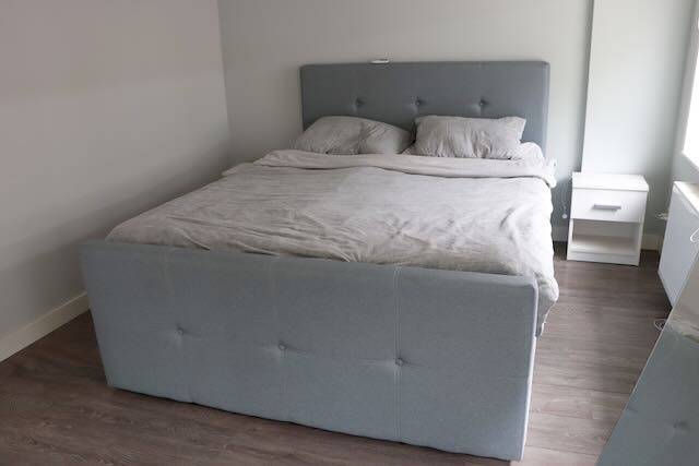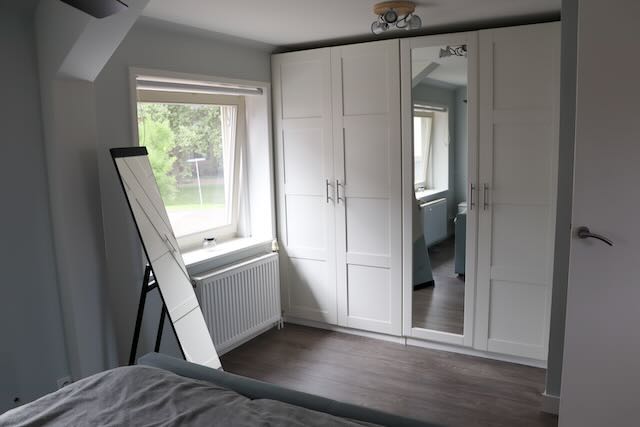 De grootste slaapkamer van het huis bevat een tweepersoonsbed en een dubbele IKEA PAX-kast. In de kast vind je verschillende planken, lades en een gedeelte om kleding op te hangen aan kledinghangers.