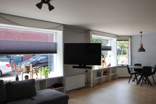De woonkamer bevat een 55inch 4K tv met verschillende beschikbare apps als: NPO, Videoland, Netflix, Pathé thuis, Disney+, NLZiet etc. In de woonkamer vind je naast de televisie ook de eetkamertafel, zit hangmat en verschillende kasten om spullen in op te bergen. De gordijnen zijn daarbij naar eigen wens en hoogte in te stellen.