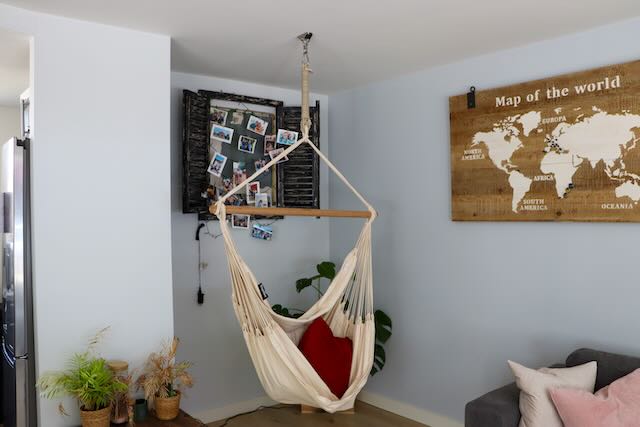 De hangstoel houdt het gewicht van 1 persoon en is de ideale plek om een film te kijken of een boek te lezen.