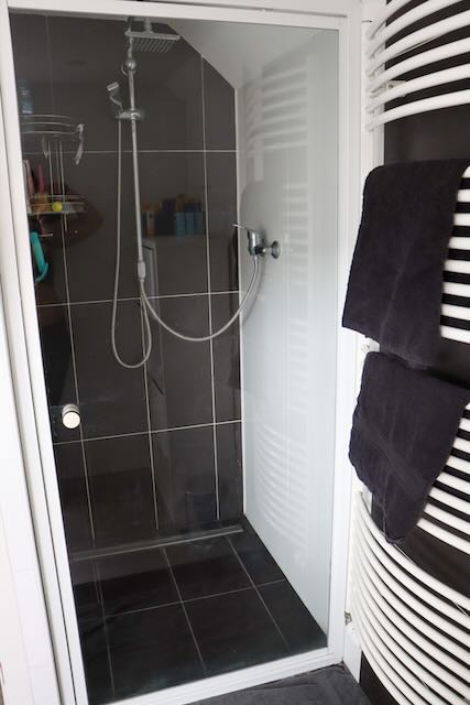 De badkamer bevat een dubbele wastafel met lades, een hoge, smalle hangkast en een staande vakkenkast. In de hoek van de badkamer vind je de douchecabine met een regendouche douchekop en een hand douchekop.